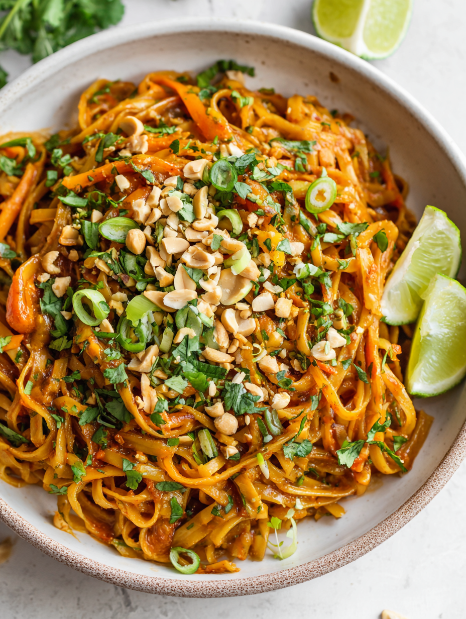 - Transfer the Pad Thai to serving plates. Top with crushed peanuts and garnish with lime wedges. Squeeze fresh lime over each serving to brighten the flavors and enjoy immediately while smoky and hot.