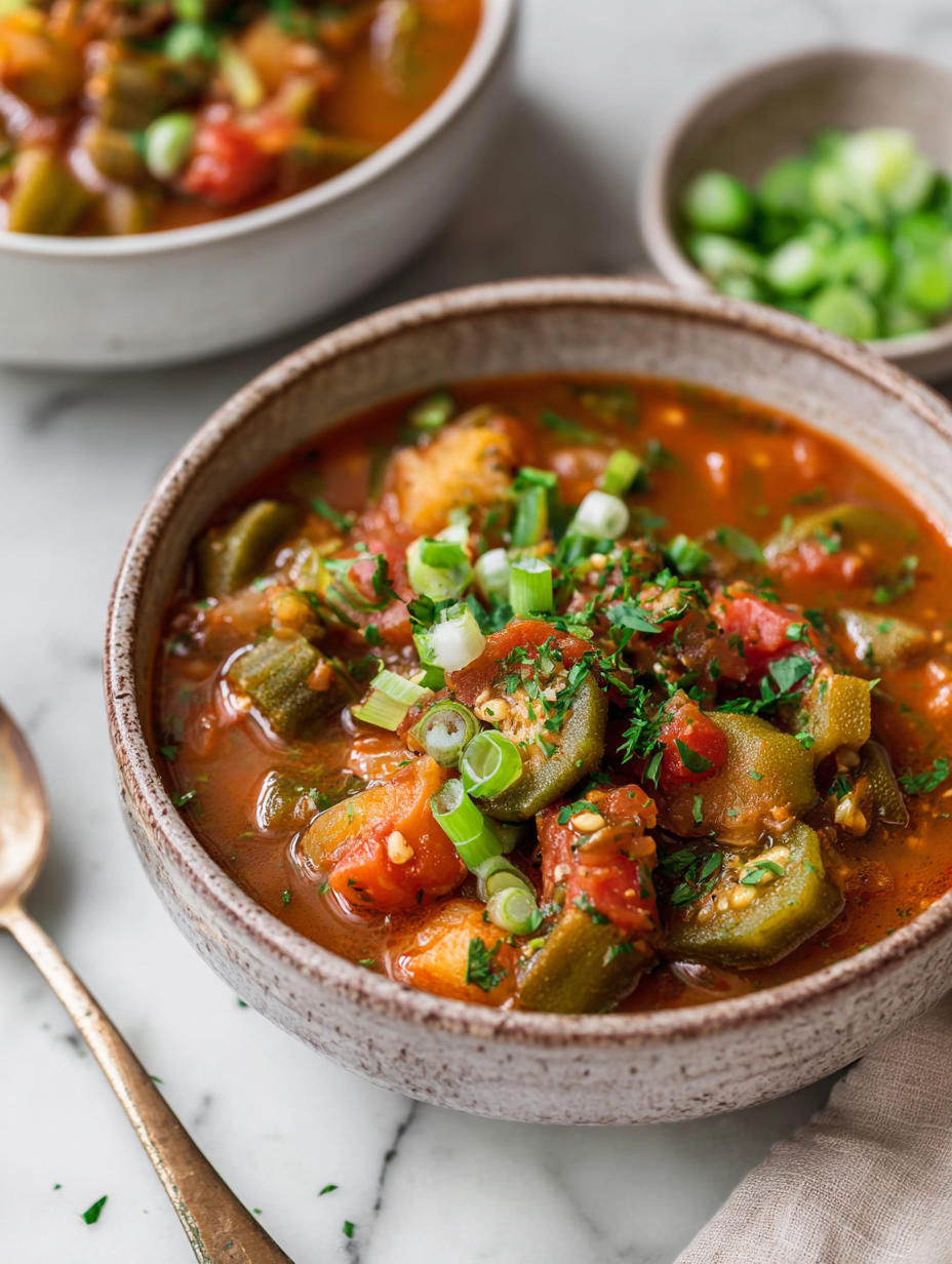 • This vegan gumbo was born out of a chilly evening when I craved the smoky, deep flavors of traditional gumbo but didn’t want to rely on meat or seafood. I started experimenting with smoky paprika, caramelized vegetables, and okra to build that familiar richness. It became a way to honor a Southern classic while keeping it plant-based and accessible.