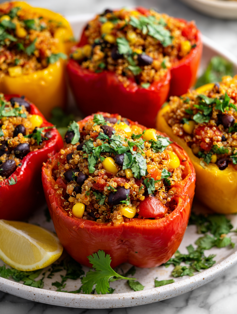 These vibrant vegan stuffed peppers are filled with a savory mix of quinoa, black beans, and spices, then baked until tender and bubbling. The peppers soften and blister slightly, creating a warm, comforting dish with a bright, fresh flavor. Perfect as a hearty main or a colorful side, they showcase a nostalgic flavor with a plant-based twist.